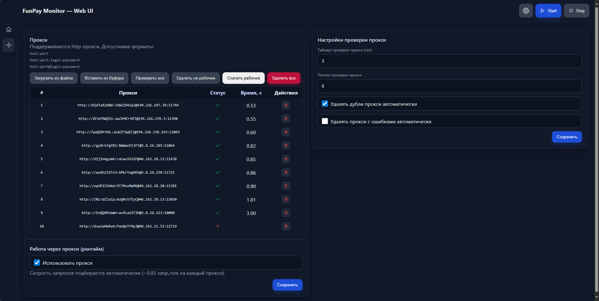 host:porthost:port:login:passwordhttp://login:password@host:portВ интерфейсе есть кнопка «Проверить все». Программа проверит каждый прокси на доступ к funpay.com и покажет статус и время отклика.