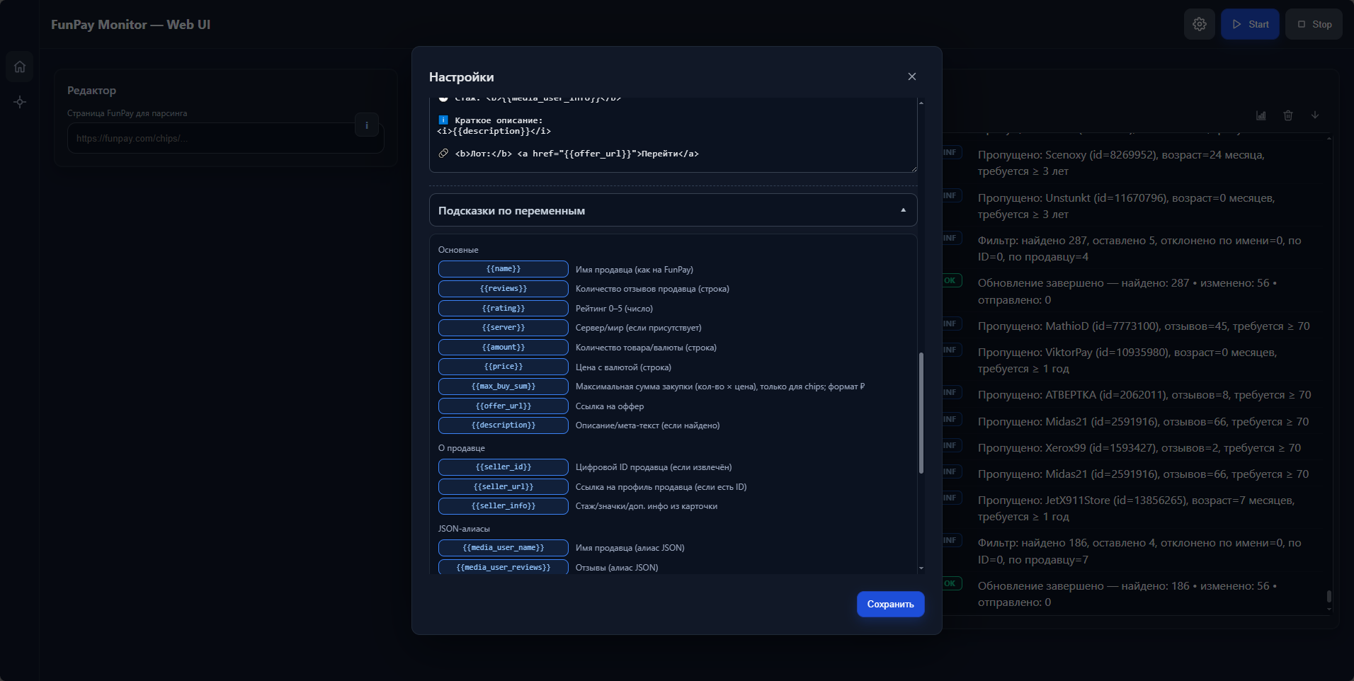Добавление и заморозка ссылок, пресеты продавцов, продвинутые настройки, живой лог и метрики.